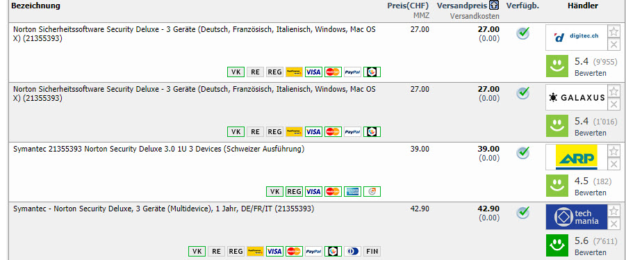 Bei Digitec ist der Preis gerutscht. Das Norton Security Deluxe (Swiss Edition) 3 Geräte kostet im Moment 27 CHF. Der zweitgünstigste Preis ist z.Zt. 39 CHF bei ARP.