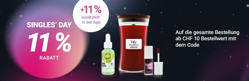 Am Singles Day erhaltet ihr bei Notino 11 Prozent Rabatt. Die 11 Prozent werden automatisch mit den Code „Singles“ abgezogen. Mit der Notino App bekommt ihr sogar 22% Rabatt.