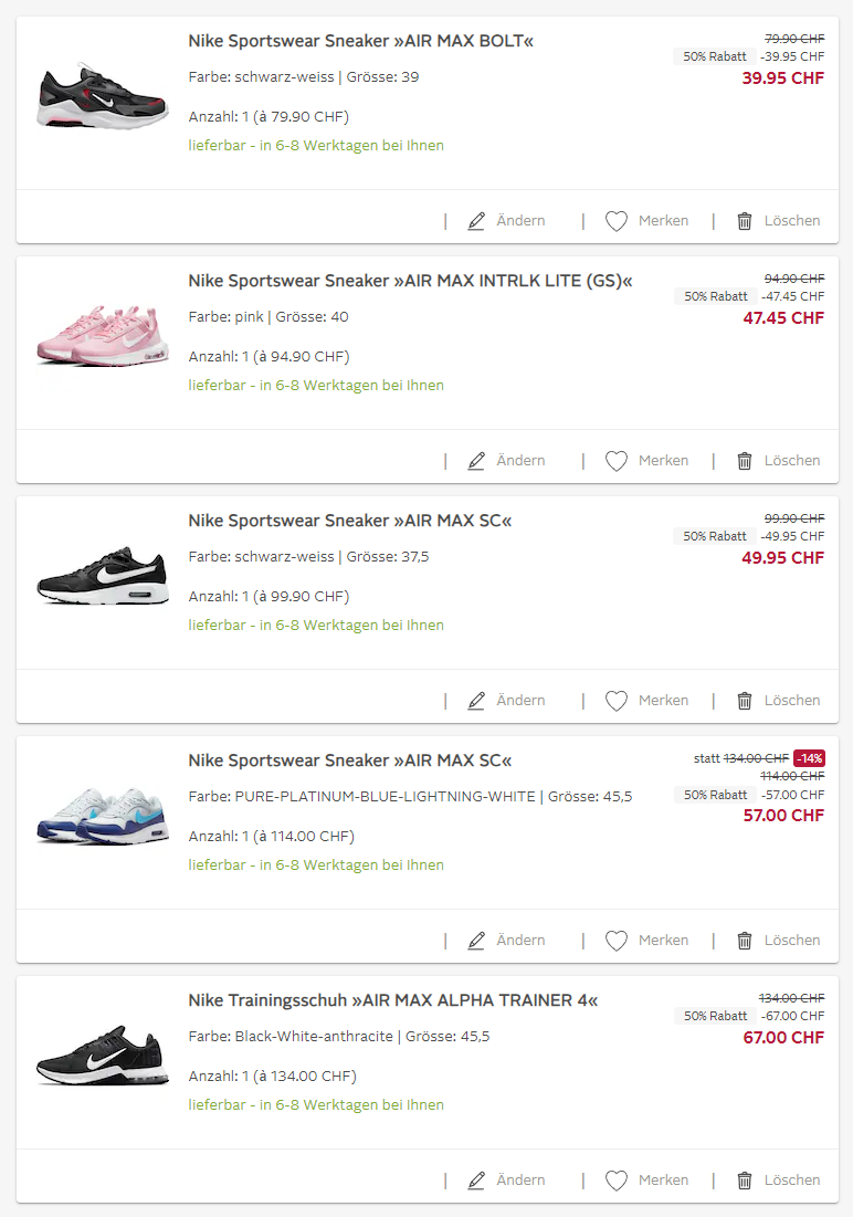 Bei Jelmoli-Shop profitiert ihr nur bis Mitternacht von 50% Rabatt auf Schuhe! So gibt’s zum Beispiel diverse Nike Air Max Sneakers zu tiefen Preisen ab 40 Franken!