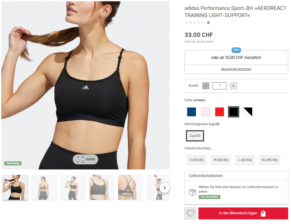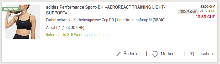 Bei Ackermann gibt’s heute wieder einmal 50% Rabatt auf diverse Kategorien. So gibt’s zum Beispiel Sport-BHs von Adidas für 16.50 Franken in diversen Grössen und Farben: