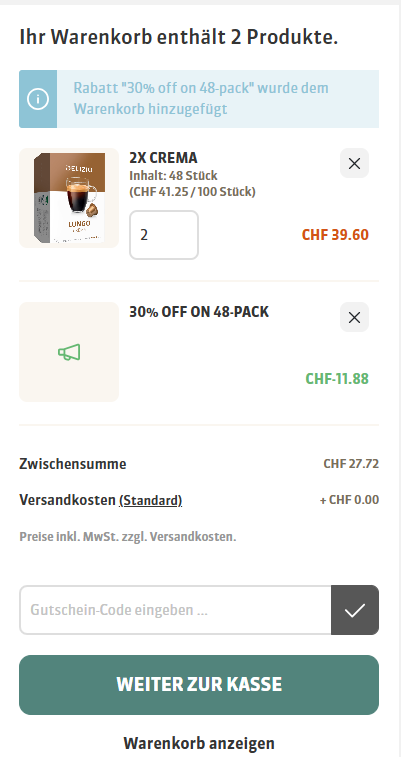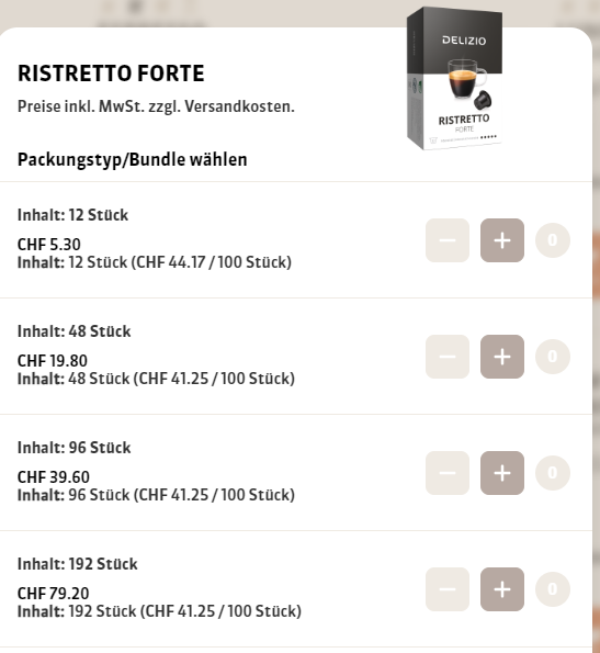 Ich probierte alles - aber eine Preisreduktion gab es nie. Ok, beim SPrung vom 12er aufs 48er Pack. Das ist aber normaler Preisverlauf. Aber ob 1, 2 oder vier 48er Pakete spielte keine Rolle - der Preis blieb immer beim gewohnten Normalpreis. (Bild)