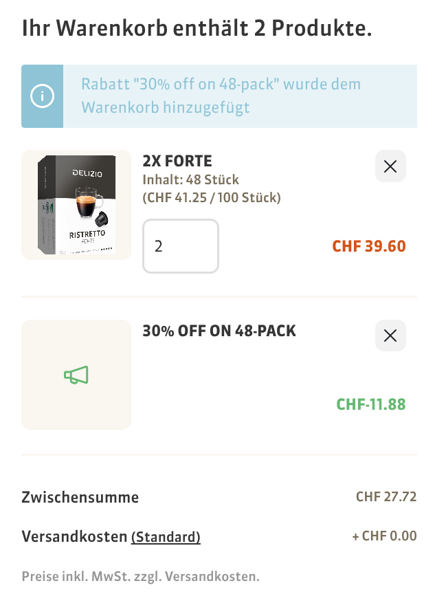 Im Onlineshop von Delizio erhaltet ihr aktuell 30% Rabatt auf alle 48er-Packungen! Bei mir zeigt’s den Rabatt zwar nur beim gemischten Set an, aber laut Email müsste es auf alle 48er Packungen gelten. Edit: Ab 2 Stück wird der Rabatt wohl automatisch angewandt 😀