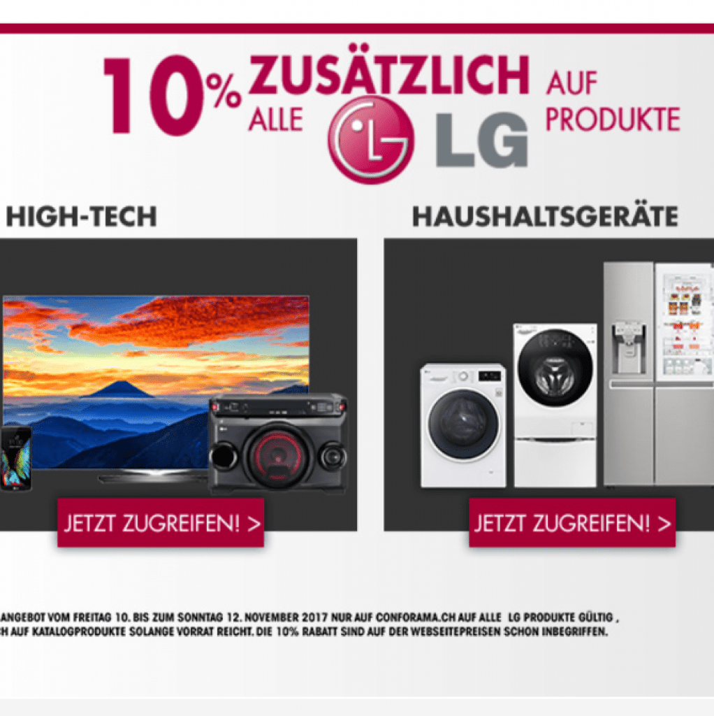 Der Rabatt lässt gilt nur heute auf Conforama.ch. Einen Gutscheincode brauchst du nicht, um von diesem Rabatt profitieren zu können. Er ist in den angezeigten Preisen schon mit inbegriffen. Aber du siehst immer auch den ursprünglichen Preis, sodass du nachvollziehen kannst, wie stark etwas reduziert ist. Von LG gibt es bei Conforama zahlreiche Produkte für die Unterhaltung, aber auch für den Haushalt.