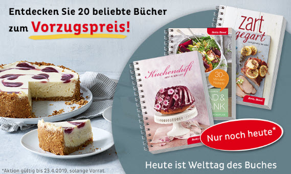Anlässlich des Welttages des Buches gibt es heute bei Betty Bossi 20 Bücher zum Vorzugspreis. Zusätzlich kann beim Checkout ab einem Mindestbestellwert von CHF 50.- der 10% Gutscheincode vsclub19 verwendet werden um noch mehr zu sparen. Leider fallen bei Betty Bossi immer Versandkosten von CHF 7.95 an. Daher empfiehlt es sich, gleich mehrere Sachen zusammen zu bestellen (oder eine Sammelbestellung mit Freunden und Nachbarn zu organisieren).