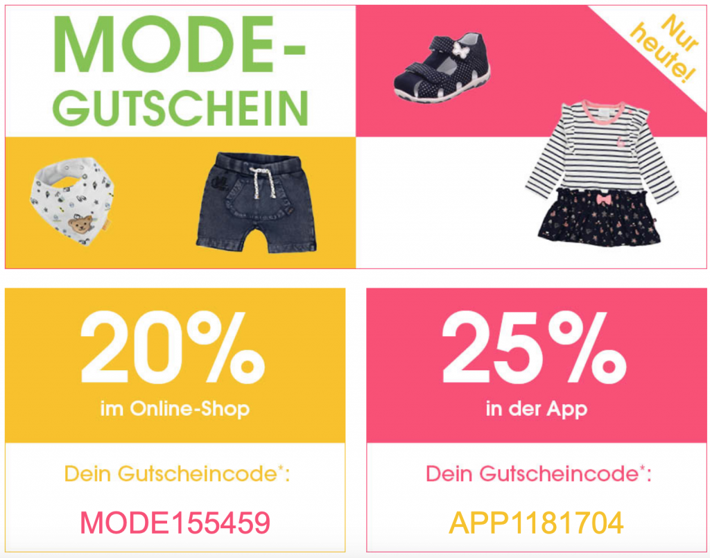 Nur heute bei Baby-Markt 20% Rabatt auf Kleinkind- und Babymode. Ausgeschlossen sind Geschenkgutscheine, Bücher und Artikel einzelner Hersteller. 2.1% zusätzlich mit Monerio nicht vergessen.
