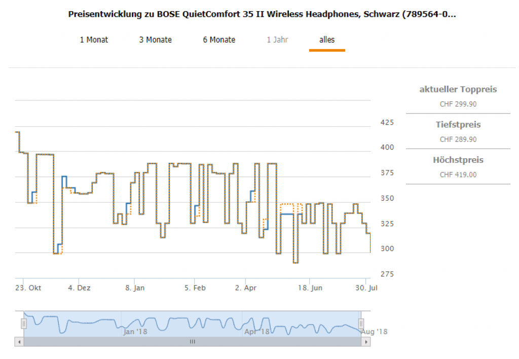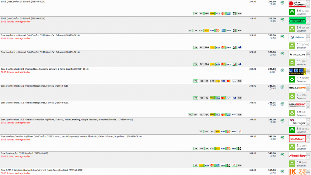 Den zweitbesten Preis bietet im Moment microspot mit CHF 319.- an. Wir hatten den Kopfhörer schon einmal für CHF 279.- mit dem Gutscheintrickli.