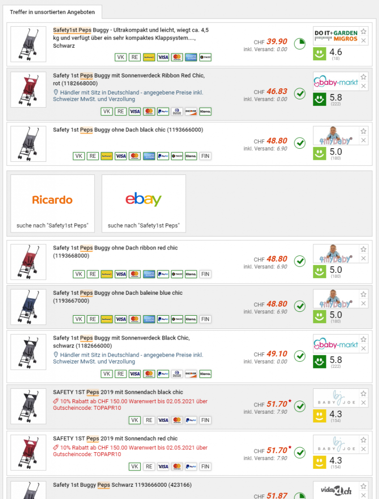 Bei Migros Do It + Garden gibts derzeit den Kinderbuggy Safety1st Peps im Angebot für unter 20 Franken inkl. gratis Lieferung. Sonst liegt der Vergleichspreis laut toppreise & Google Shopping bei über 46 Franken.