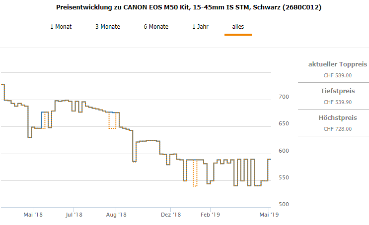 Bei interdiscount gibt’s heute die Kamera CANON EOS M50 Black inkl. EF-M 15-45mm für CHF 499.90. Sonst bietet der Händler sie für CHF 599.90 an. Mit unter 500 Franken ist das das beste Angebot für dieses Gerät in der Schweiz, denn der laut toppreise.ch beste Preis liegt bei CHF 589.- von Fust, digitec, Brack und MediaMarkt. Noch nie vorher gab es die CANON EOS M50 Black inkl. EF-M 15-45mm für weniger als CHF 500.-.