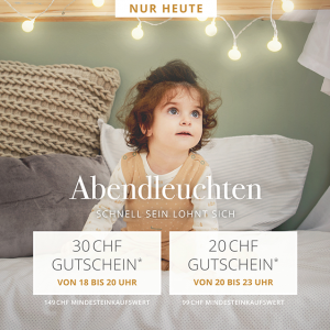 Bei babywalz gibt es nur heute ab 18:00 bis 20:00 einen CHF 30.- Gutschein ab einem Einkauf von CHF 149.-. Ebenfalls gibt es ab 20:00 bis 23:00 einen CHF 20.- Gutschein ab einem Einkauf von CHF 99.-