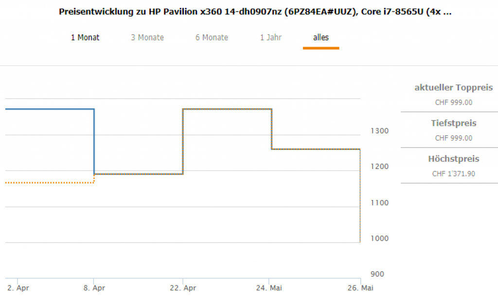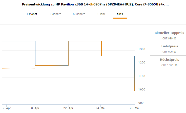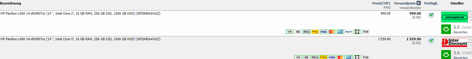 microspot bietet aktuell den HP Pavilion x360 14-dh0907nz für nur CHF 999.-. Laut toppreise.ch ist das der niedrigste Preis bisher für das Gerät. Auch im Vergleich mit den aktuellen Angeboten muss sich der Deal nicht verstecken, denn der Vergleichspreis liegt bei CHF 1259.90.