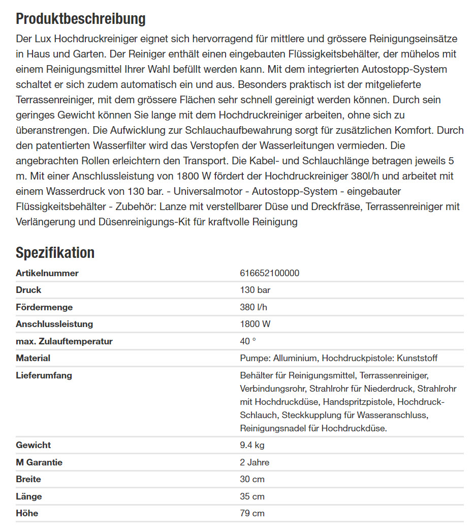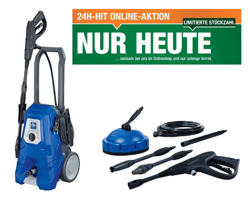 In der 24h Aktion von Migros Do It + Garden gibt es heute 35 Stück des Lux Hochdruckreinigers HD 1800W (inkl. Terrassenreiniger) zum Bestpreis von CHF 89.- wenn man sich vorgängig zum Newsletter anmeldet und den erhaltenen Gutscheincode vor dem Kauf beim Checkout eingibt.