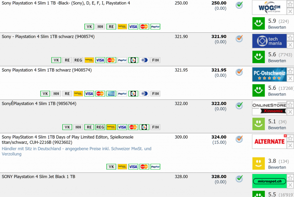 - PS 4 Slim 1TB für CHF 250.- // Bestpreis toppreise: CHF 227.- // Zweitbester Preis: CHF 321.90