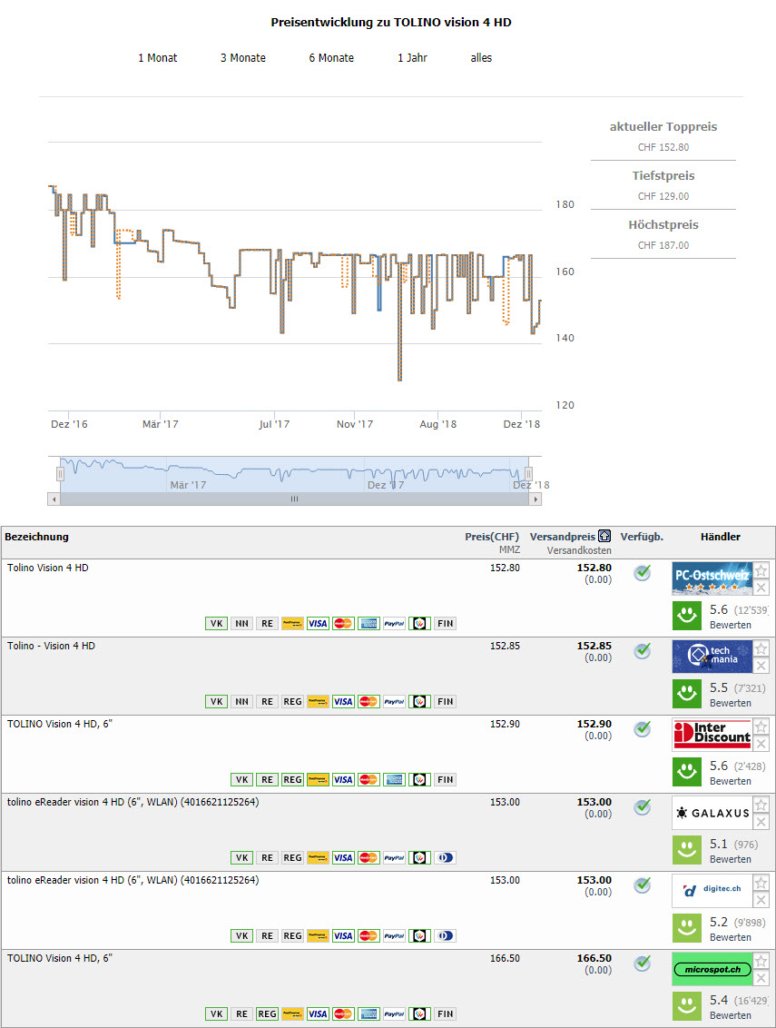 Laut toppreise lag der Tiefstpreis für den Tolino Vision 4 HD im Mai 2018 mal kurz bei CHF 129.-. Die Hülle kostet rund CHF 30 und die Displayschutzfolien etwa CHF 12. Mit dem eBook Gutschein über CHF 10.- ergibt sich damit ein Gesamtbetrag von rund CHF 180.-.