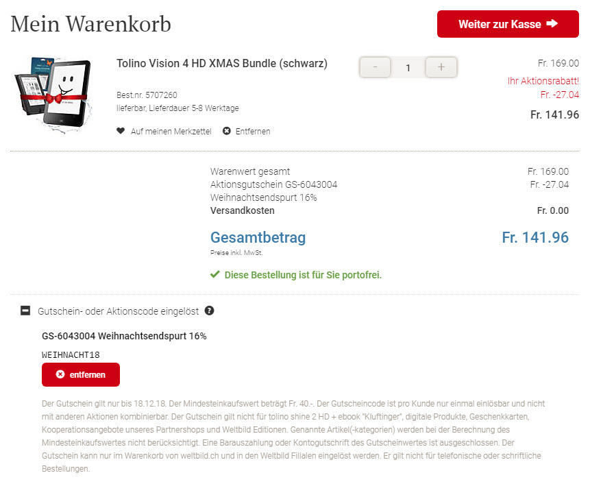 Bis zum 18.12.2018 gibt es bei Weltbild den Tolino Vision 4 HD eBook-Reader als XMAS Bundle für CHF 169.-. Das Bundle beinhaltet neben dem Tolino Vision 4 HD zusätzlich eine Tasche, ein 2er Pack Displayschutzfolien und ein ebook Gutschein in der Höhe von CHF 10.-. Löst man beim Checkout noch den Gutscheincode WEIHNACHT18 ein, so werden nochmals 16% Rabatt abgezogen und man kommt auf einen Endpreis von CHF 141.96 (versandkostenfrei).
