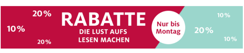 Nur heute Montag gibt’s bei Ex Libris das Angebot 10% auf alle Bücher und 20% auf ausgewählte E-Books für 10% bzw. 20% Rabatt.