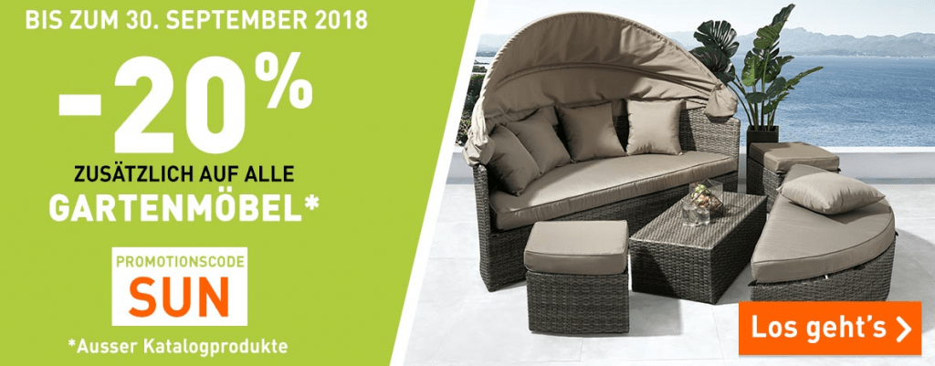 Nur noch heute gibt es bei Conforama 20% auf alle Möbel sowie 10% auf alle Elektrohaushaltgeräte. Zusätzlich gibt es bei 30.09. 20% auf alle Gartenmöbel (Code: SUN)