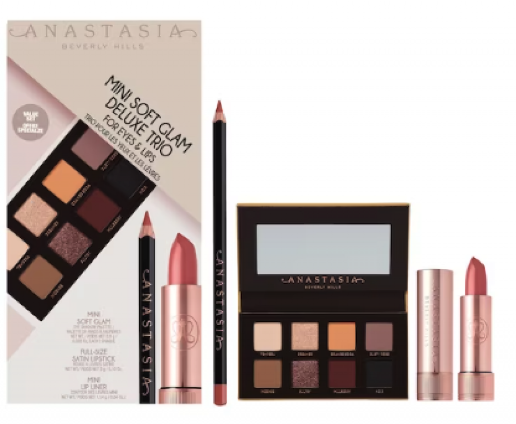 Mit dem Mini Soft Glam Deluxe Trio präsentiert Anastasia Beverly Hills ein exklusives Set für aufregende Lippen- und Augen-Make-up-Looks. Die 8 hochpigmentierten Lidschattennuancen sorgen für ein atemberaubendes Augen-Make-up – von matten Tönen bis zu glamourösen Schimmernuancen, der Lippenstift punktet mit einer satten Farbabgabe und schenkt den Lippen ein geschmeidiges Finish, während der Lip Liner mit seinem lang anhaltenden, samtig-matten Look und seiner cremigen Formel überzeugt.