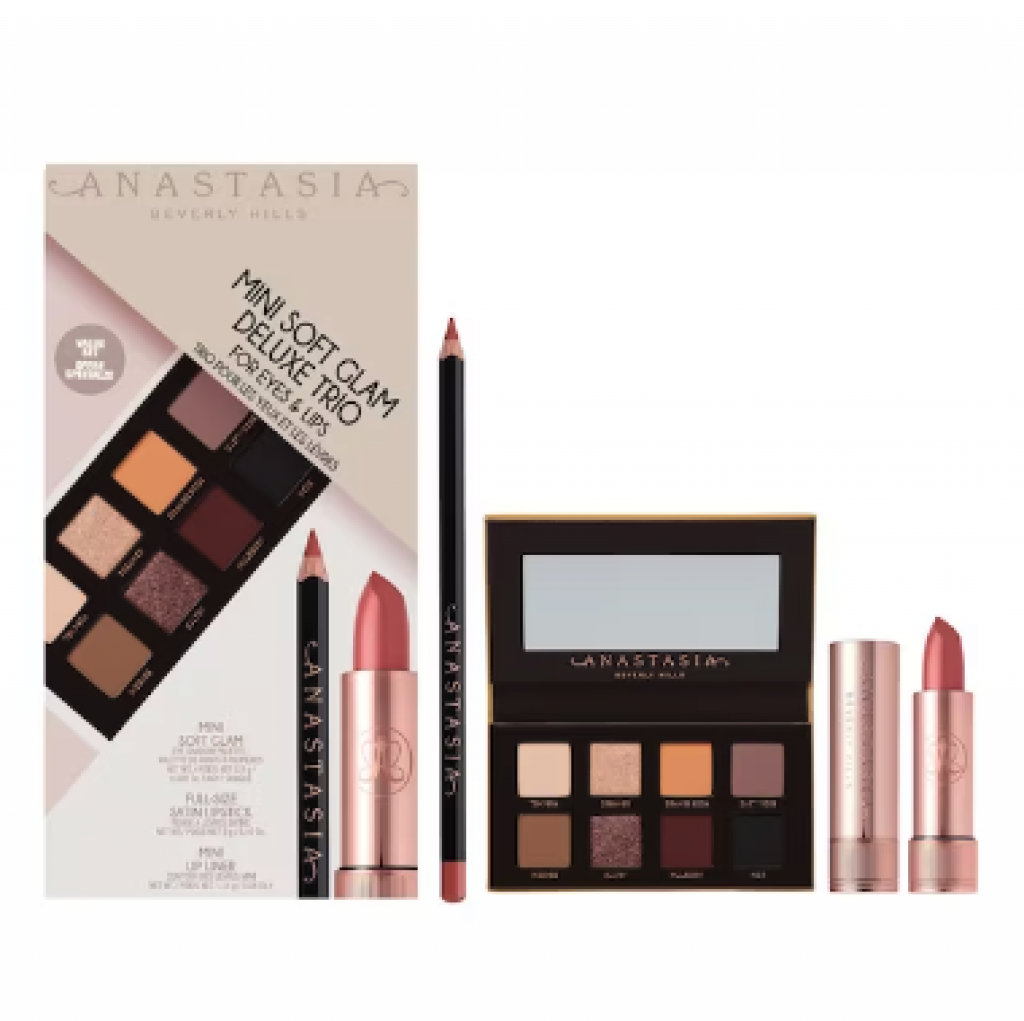 Mit dem Mini Soft Glam Deluxe Trio präsentiert Anastasia Beverly Hills ein exklusives Set für aufregende Lippen- und Augen-Make-up-Looks. Die 8 hochpigmentierten Lidschattennuancen sorgen für ein atemberaubendes Augen-Make-up – von matten Tönen bis zu glamourösen Schimmernuancen, der Lippenstift punktet mit einer satten Farbabgabe und schenkt den Lippen ein geschmeidiges Finish, während der Lip Liner mit seinem lang anhaltenden, samtig-matten Look und seiner cremigen Formel überzeugt.