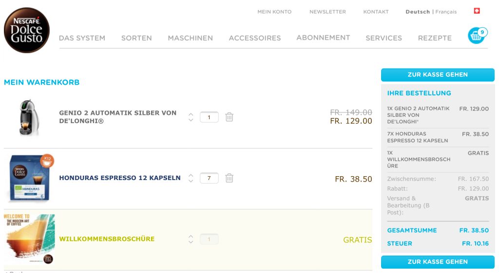 Soweit ich gesehen habe kosten die günstigsten Kapselboxen 5.50 CHF, somit zahlt ihr für 7 Boxen zusammen mit der Maschine 38.50 CHF.