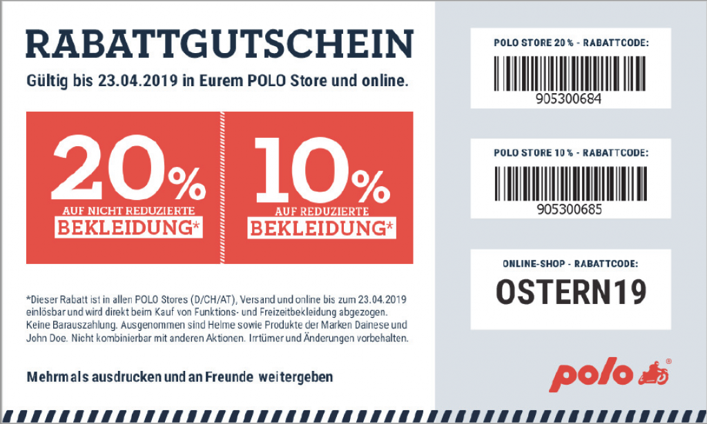 Es gibt 20% Rabatt auf alle Bekleidungsartikel, die nicht bereits reduziert sind. Für reduzierte Artikel gibt’s noch 10%. Helme und Artikel von Dainese und John Doe sind leider nicht von der Aktion betroffen. Es gibt allerdings keinen Mindestbestellwert.