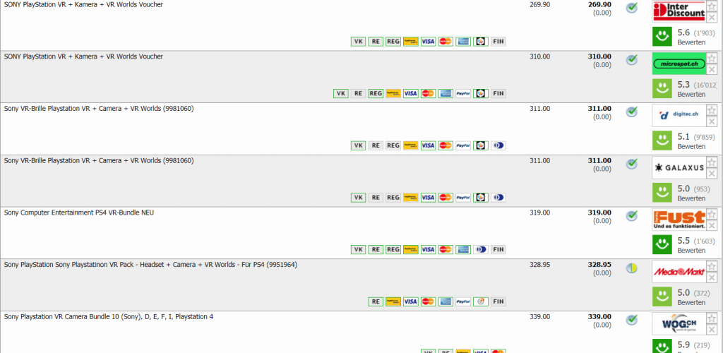 Mit dem Interdiscount 10% auf alle Geräte Rabatt gibt’s unter anderem auch die Sony PlayStation VR inkl. Kamera und VR World Voucher zum neuen Bestpreis bei Interdiscount. Der zweitbeste Preis in der Schweiz liegt momentan bei CHF 310.- Der beste laut toppreise gemessene Preis war bis zu diesem Angebot bei CHF 299.-