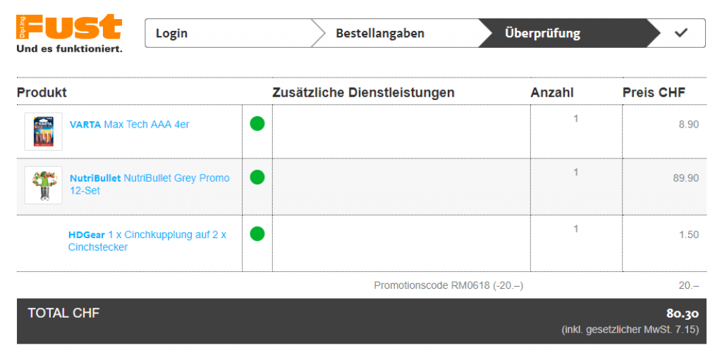 Den Preis erreichst du natürlich nur als richtiger Preispirat. Du musst nämlich einen Warenwert von mindestens 100 CHF erreichen um danach den Gutscheincode von Fust einzulösen. Die AAA Batterien und die Cinchkupplung sind ein Vorschlag, damit du möglichst genau auf 100 CHF kommst, du kannst natürlich auch komplett andere Produkte verwenden!