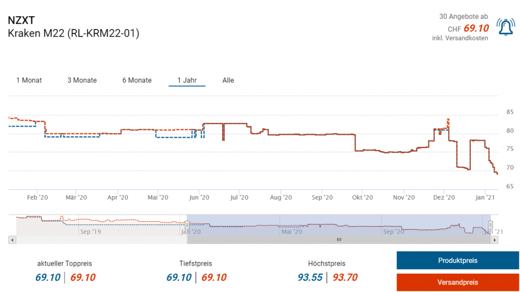 Wirkt jetzt im Preisvergleich nicht nach einem wahnsinnig guten Angebot, aber auch in der Schweiz gab es in den letzten Tagen einen Preissturz. Bei Amazon gibt’s die NZXT Kraken M22 120 mm - All-In-One RGB-CPU-Wasserkühlung für umgerechnet CHF 61.70, in der Schweiz ab CHF 69.10