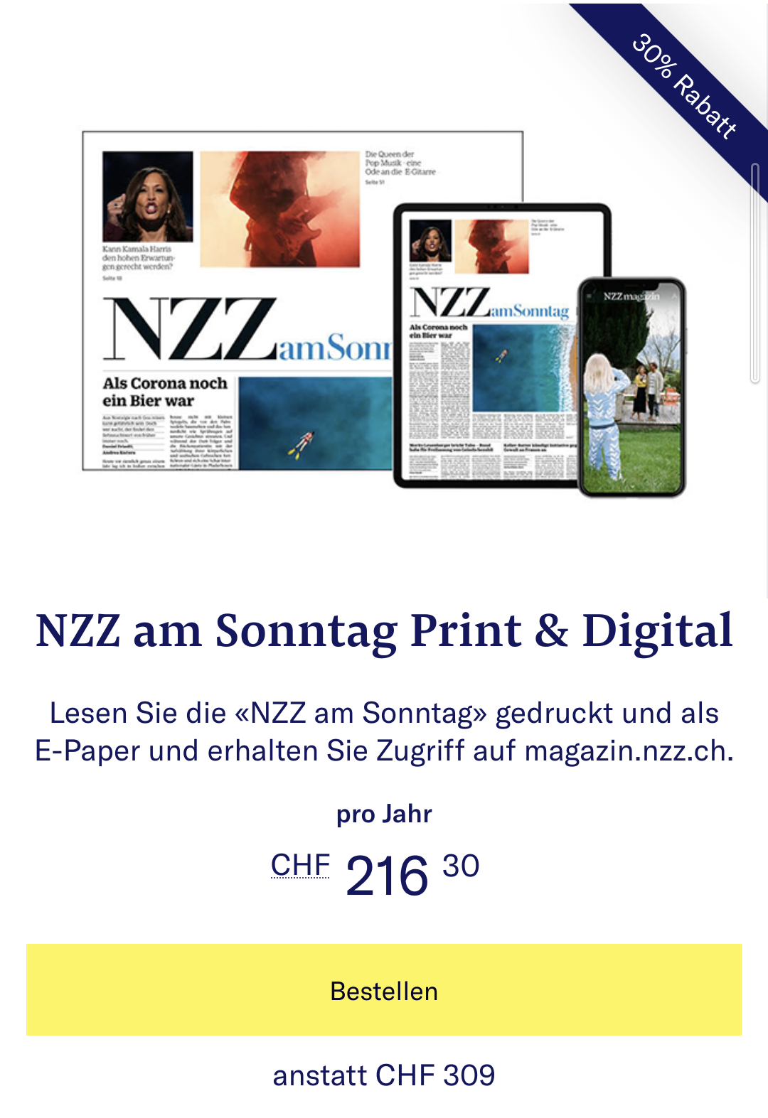 Die NZZ am Sonntag gibt es aktuell als Print & digitale Ausgabe für 216.30 statt 309.- pro Jahr. Digital ist einerseits das E-Paper, andererseits der Zugriff auf magazin.nzz.ch inbegriffen. Nur für Neukunden, gültig bis 31.12.2022. Mit Pressreader und ähnlichen Services kann das Angebot natürlich nicht mithalten. Wer aber gerne eine gedruckte Zeitung im Briefkasten hat am Sonntagmorgen kann mit der Aktion rund 90 Fr. sparen.