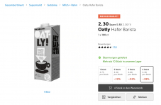 Ob dauerhaft oder nicht entzieht sich meiner Kenntnis: Bei Galaxus gibt es beim Kauf von mindestens vier Stück den Liter Oatly Barista Hafermilch für CHF 2.30. Bei den hiesigen Grossverteilern zwischen CHF 3.55 und 3.75, im grossen Kanton auch nirgends günstiger als zum derzeitigen Galaxus-Preis. Ab einer Bestellsumme von CHF 50.- entfällt der Kleinmengenzuschlag in Höhe von CHF 4.50.