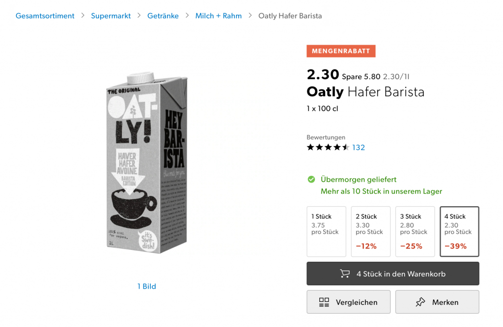 Ob dauerhaft oder nicht entzieht sich meiner Kenntnis: Bei Galaxus gibt es beim Kauf von mindestens vier Stück den Liter Oatly Barista Hafermilch für CHF 2.30. Bei den hiesigen Grossverteilern zwischen CHF 3.55 und 3.75, im grossen Kanton auch nirgends günstiger als zum derzeitigen Galaxus-Preis. Ab einer Bestellsumme von CHF 50.- entfällt der Kleinmengenzuschlag in Höhe von CHF 4.50.