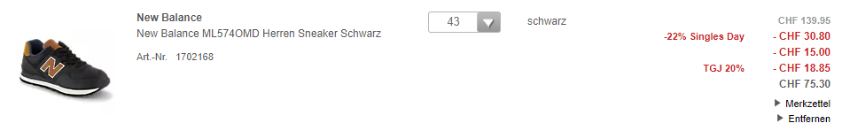 Zum Beispiel gibt’s so die New Balance Schuhe ML574OMD für CHF 75.30