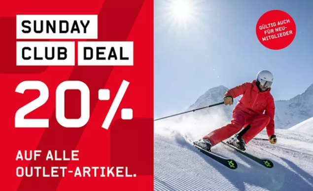 Nur heute gibt es bei Ochsner Sport den Sunday Club Deal mit 20% Rabatt auf alle Outlet-Artikel. Nur für CLUB Mitglieder oder Neu-Mitglieder.