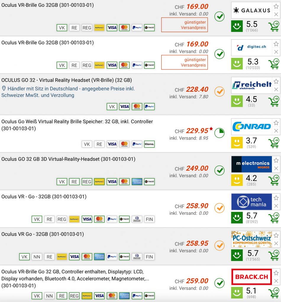 Bei digitec gibt es aktuell die OCULUS Go, 32GB für 169.- CHF.