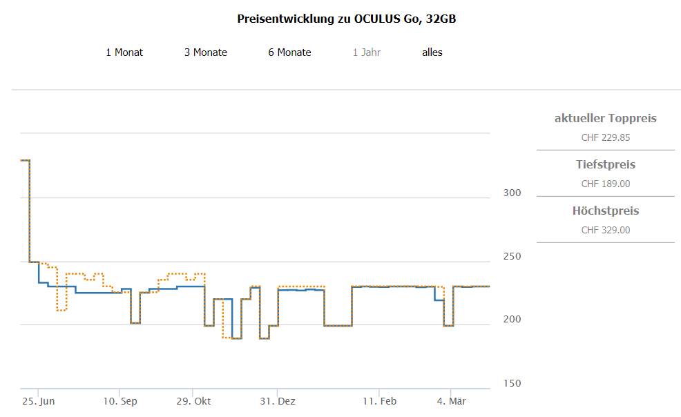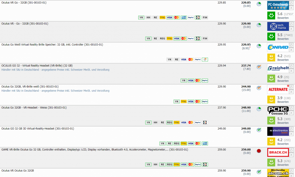 Im digitec Tagesdeal gibt’s heute Oculus Go 32GB für CHF 179.- Bestpreis war laut toppreise bei CHF 189.- momentan liegt der zweitbeste Preis bei CHF 229.85