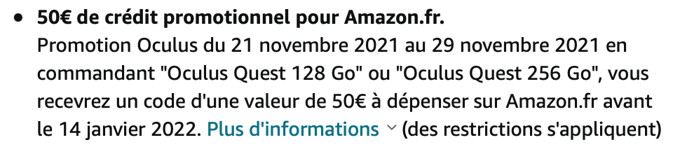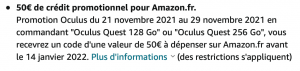 Bei Amazon Frankreich erhaltet ihr derzeit die Oculus Quest 2 128GB für 314,12 Euro. Dazu gibt es nach Versand 50 Euro Gutschein (gültig bis 13.1.22) und bei einigen Accounts noch einen 15 Euro Gutschein (365 Tage gültig). Wichtig die Gutscheine werden nur für Amazon Frankreich gültig sein.