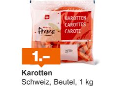 Bei Migros gibts auch diese Woche wieder die Vitamine für 1 Franken Aktion. Dieses Mal gibts 500g Kiwis, 1kg Rüebli oder Kartoffeln (festkochend) für je 1 Franken. Das Angebot gilt scheinbar nur vorort (zumindest konnte ich die Orangen letzte Woche nicht zum Aktionspreis online vorfinden).