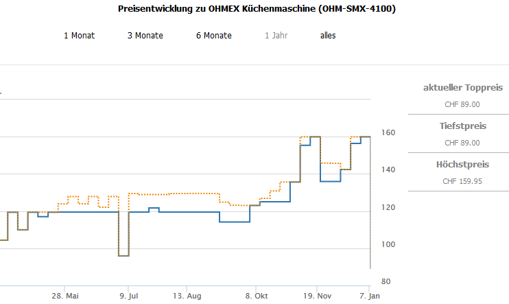 Wer sich bereits einmal für Küchenmaschinen interessiert hat, der weiss wo da so ca. die Preise stehen. Dieses Modell gab es lange Zeit für um die 120.- , nun hat es eben einen Preisrutsch hinter sich.