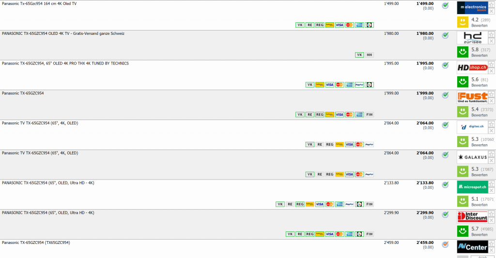 Und munter weiter geht’s mit den Deals von melectronics. Mit dem Gutscheincode 15%tv sowie dem 10.- Newsletter-Code von melectronics erhält man den PANASONIC TX-65GZC954 mit 65“ 4K OLED Display für CHF 1264.15. Zweitbester Preis: CHF 1980.-