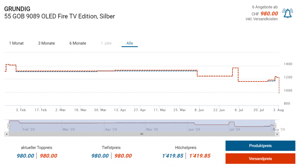 Bei digitec gibts derzeit den OLED-Fernseher 55GOB9089 von Grundig mit Fire TV zum Aktionspreis von 980 Franken anstatt CHF 1224.-. Laut toppreise liegt der Vergleichspreis beim zweitgünstigsten Händler sogar bei mehr als 1323 Franken.