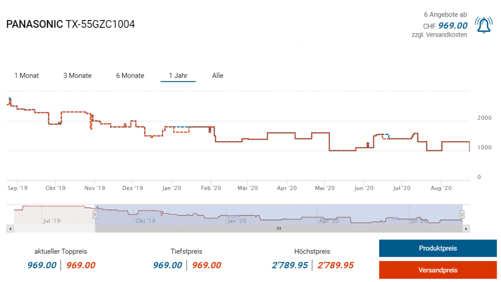 Bei digitec gibts derzeit das letztjährige OLED-Mittelklasse-Modell von Panasonic zum Aktionspreis von 969 Franken. Es sind leider nur noch 2 Exemplare verfügbar aber vielleicht können ja noch zwei Preispiraten davon profitieren 😉