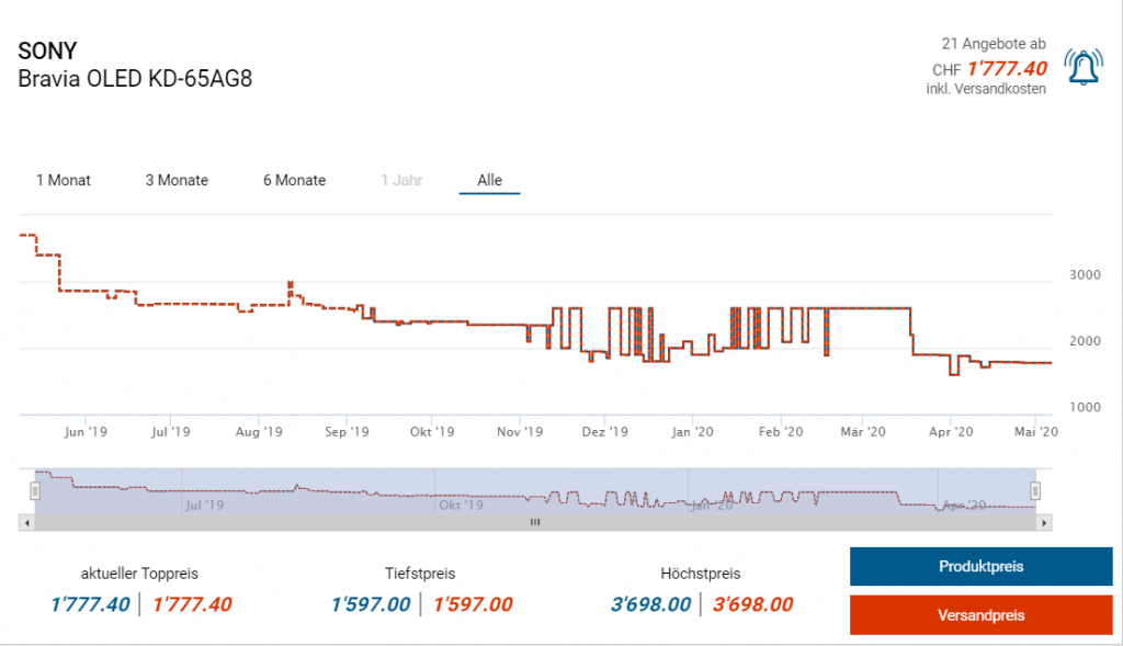 Bei Interdiscount gibts derzeit den Sony KD-65AG8 OLED Fernseher zum guten Preis. Wer den Hammer-Deal von letztem Wochenende verpasst hat, der kann hier zu etwas schlechteren Konditionen noch zugreifen. Der Allzeitbestpreis lag demnach bei CHF 1434.15, zurzeit gibts ihn ab 1699 Franken (inkl. 20x Cumulus-Punkten) bei melectronics, auf toppreise sind sie aber (komischerweise) nicht gelistet.
