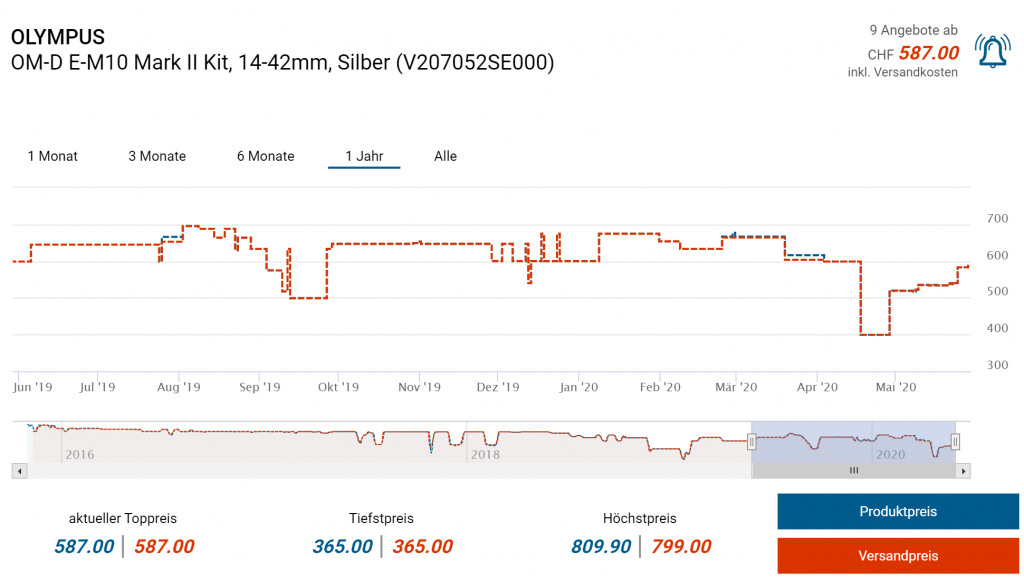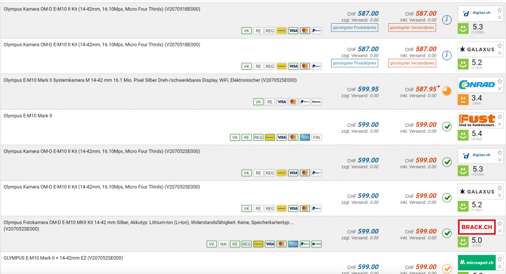 Im Schweizer Olympus Shop gibt’s gerade das Olympus OM-D E-M10 Mark II 14-42mm II R Kit für CHF 333.- wenn man den Gutscheincode OMD333 einsetzt. Zweitbester Preis beträgt CHF 587.- Bestpreis war bei CHF 365.- Es handelt sich dabei um ein bereits etwas älteres Gerät, das seit 2016 auf dem Markt ist.