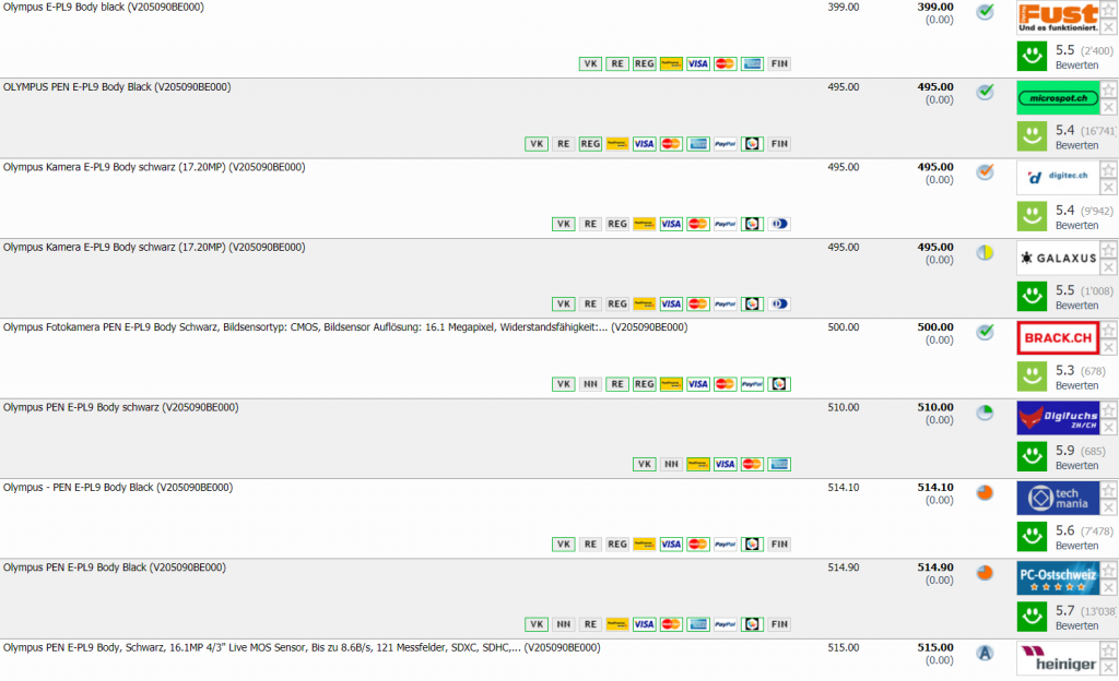 Bei Fust gibt’s die OLYMPUS Pen E-PL9 Body in verschiedenen Farben für CHF 399.- Mit Gutscheincode 1119RM sogar noch 20.- günstiger. Zweitbester Preis über die verschiedenen Farben hinweg beträgt CHF 495.- Bestpreis über die verschiedenen Farbvarianten hinweg war bisher bei CHF 449.-