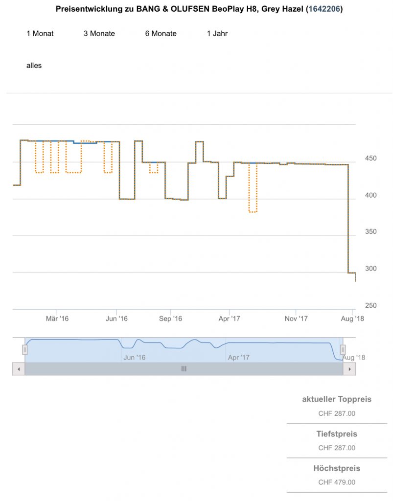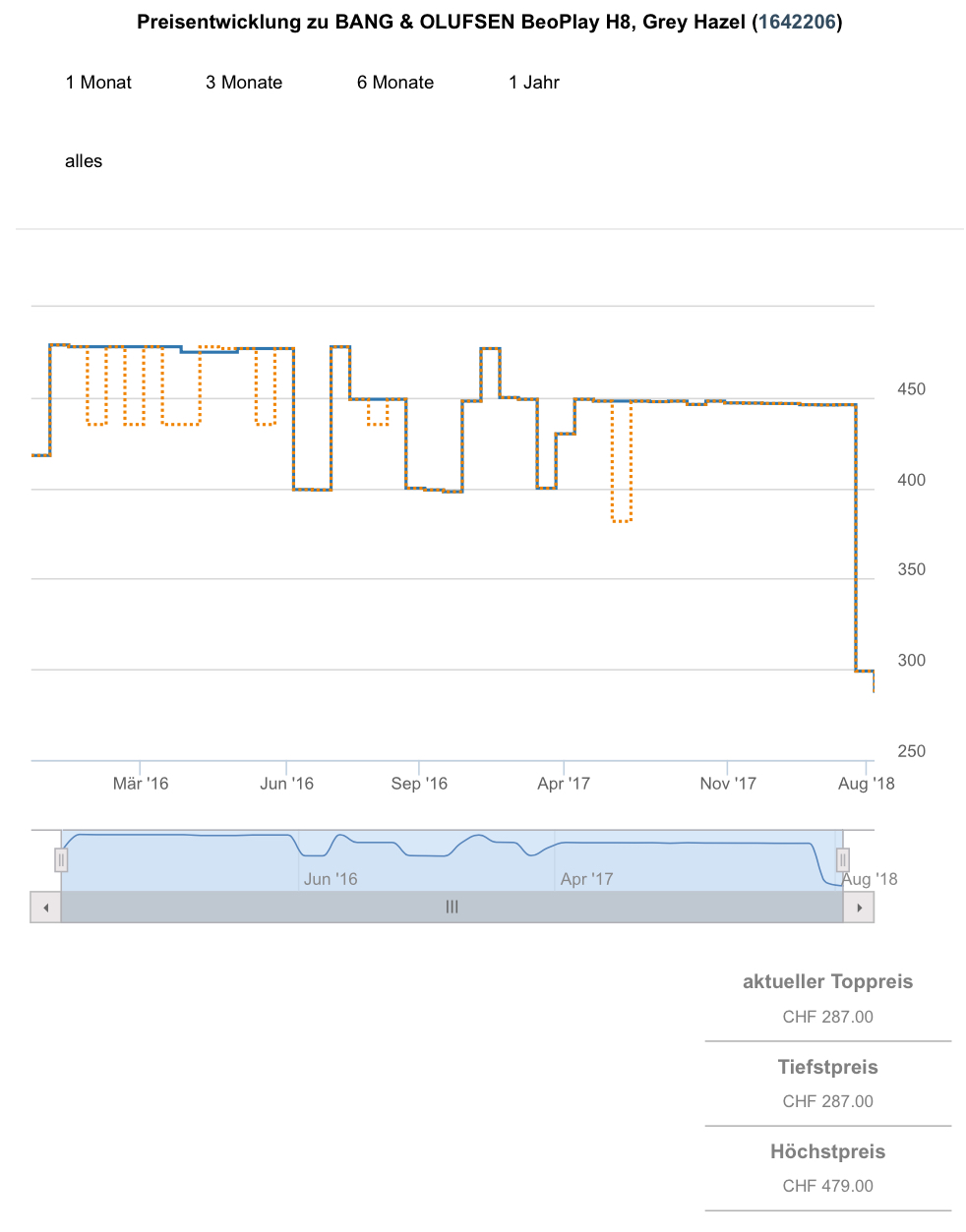 Gemäss toppreise gab es den Kopfhörer bislang nie günstiger als für 299.- CHF, der zweitbeste Preis liegt aktuell bei 399.- CHF. In der Farbe Argilla Bright gab es den Kopfhörer anscheinend mal für 249.50 CHF sowie in Natural für 284.70 CHF.