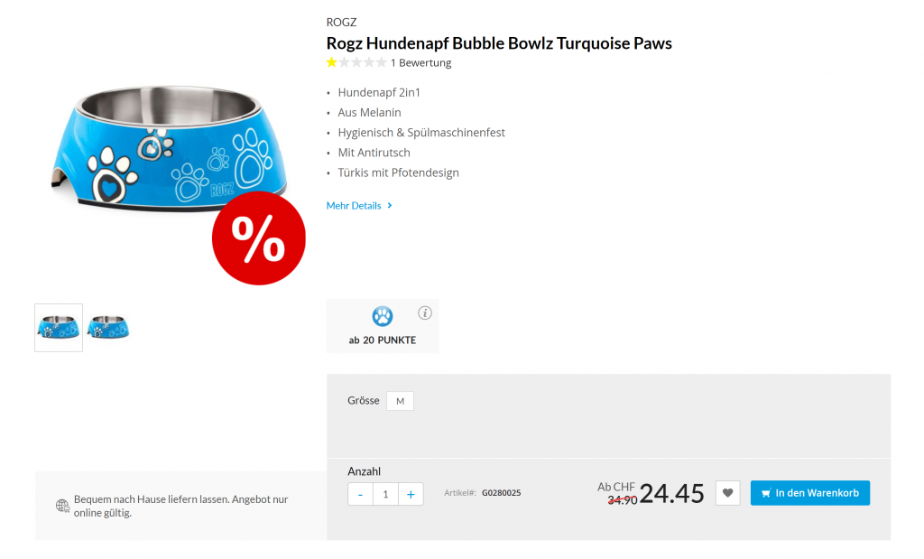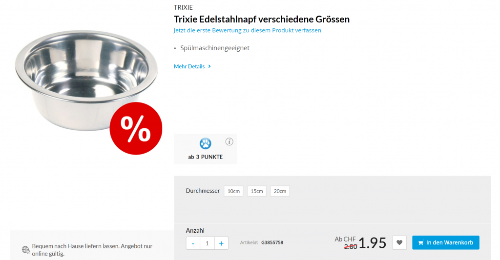 Qualipet leer sein Online-Lager und gibt auf viele Artikel etwas Rabatt. Es lohnt sich, etwas zu stöbern. Vielleicht findet man ein paar gute Schnapper. Wichtig ist jedoch: Der Versand ist erst ab einem Bestellwert von 99 Franken gratis und viele Abverkauf-Artikel kosten nur wenige Franken. Lohnt sich also vor allem, wenn man noch etwas grösseres zusätzlich bestellt. Zudem: Wenn man für unter 44 Franken bestellt, muss man einen Kleinmengenzuschlag von 5 Franken bezahlen.