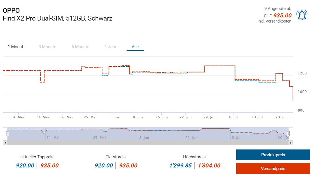 Bei Alternate gibts heute das Android-Smartphone Find X2 Pro von Oppo zum neuen Bestpreis von 935 Franken. Laut toppreise lag der bisher tiefstgemessene Preis beim zurzeit auch zweitgünstigsten Preis, nämlich knapp 1080 Franken.