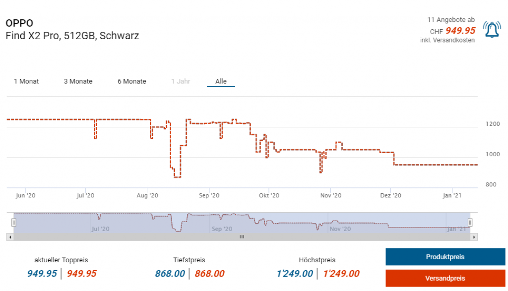 Bei Amazon Frankreich gibts den grossen Bruder des Find X2, dem Find X2 Pro zum günstigen Preis von knapp 809 Franken. Laut toppreise läge der Vergleichspreis bei knapp 950 Franken.