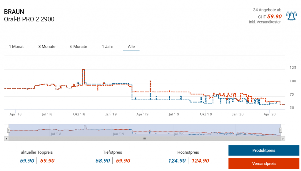 Bei amazon.de gibts derzeit die Schallzahnbürste Pro 2 2900 von Oral-B zum neuen Bestpreis. So zahlt ihr inkl. Lieferung weniger als 53 Franken, der zweitbeste Preis, der auch den bisherigen Bestpreis darstellt, liegt bei CHF 59.90.