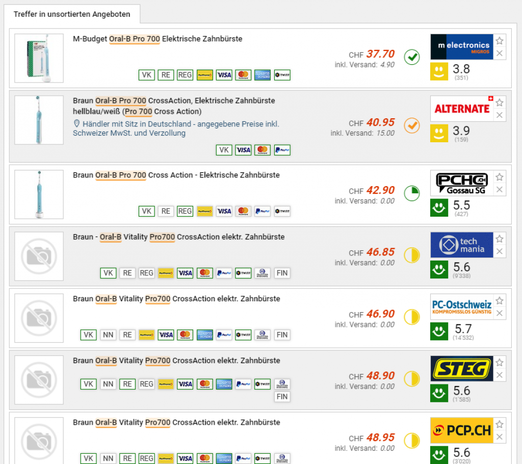 Bei Amazon und melectronics gibts derzeit die elektrischen Zahnbürsten Oral-B Pro 750 und 700 Sensitive zum Preis von knapp 36 resp. 38 Franken.