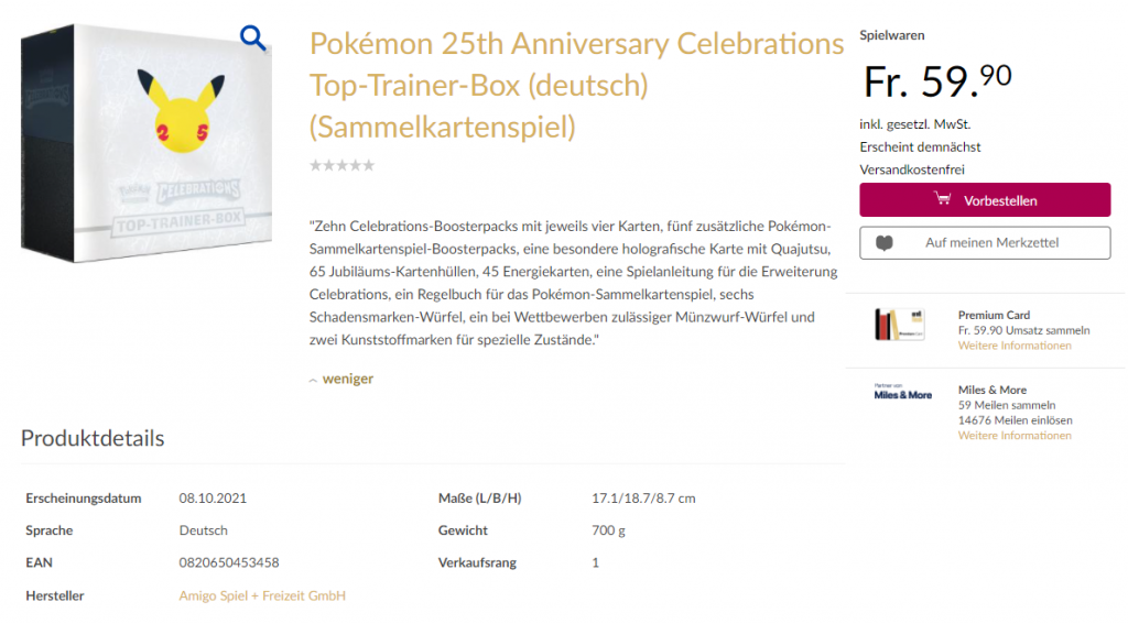 So gibt’s z.B. die Pokémon 25th Anniversary Celebrations Top-Trainer-Box (deutsch) zum Preis von CHF 47.90. Bei Ex Libris oder CeDe würde es hingegen ab 78.75 Franken kosten.